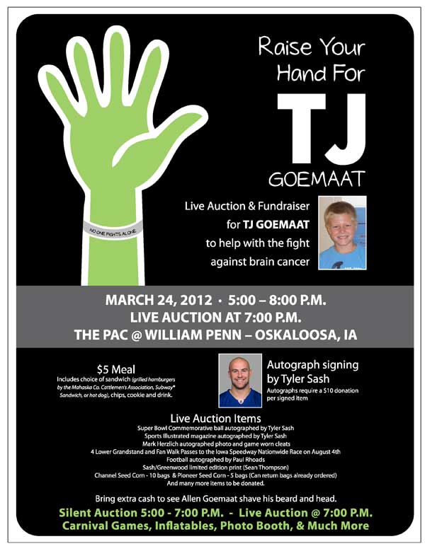 Worked with event committee to develop an eye-catching poster for the fundraising event. “Raise your hand” was an original concept I developed. It was fitting since the event was a live auction. Event brought in over $100,000 for the family.